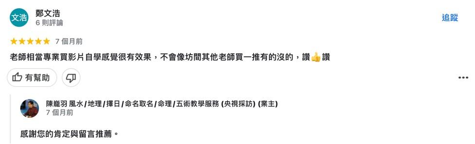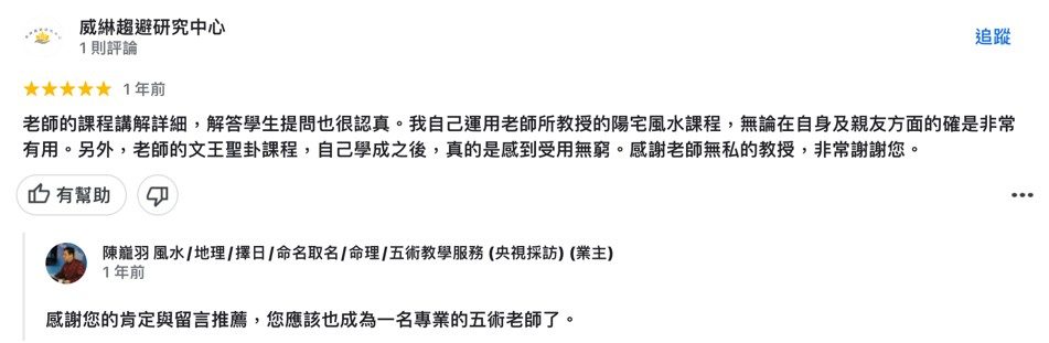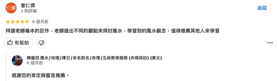 本区搜集来自谷歌地图商家”陈巃羽 风水/地理/择日/命名取名/命理/五术教学服务”的客户评价